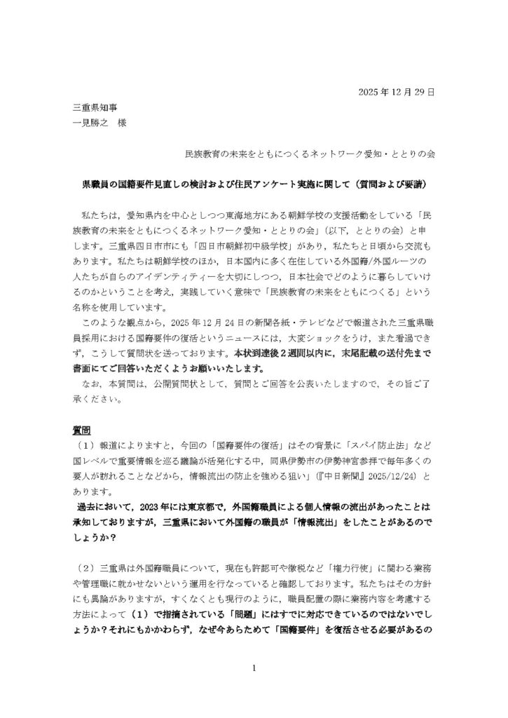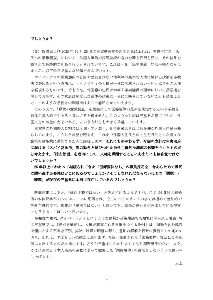 2025年12月24日の新聞などで報道されたましたが、三重県は職員採用において国籍要件を復活させる方向で検討を進めています。三重県知事は「排外主義ではない」と述べていますが、知事の認識にかかわらず、国籍要件の復活は明らかな外国人差別であり、排外主義です。地方公務員の国籍要件の撤廃は、民族差別・就職差別との粘り強い闘いによって勝ち取られた成果であり、歴史を巻き戻すような差別的暴挙を決して許してはなりません。